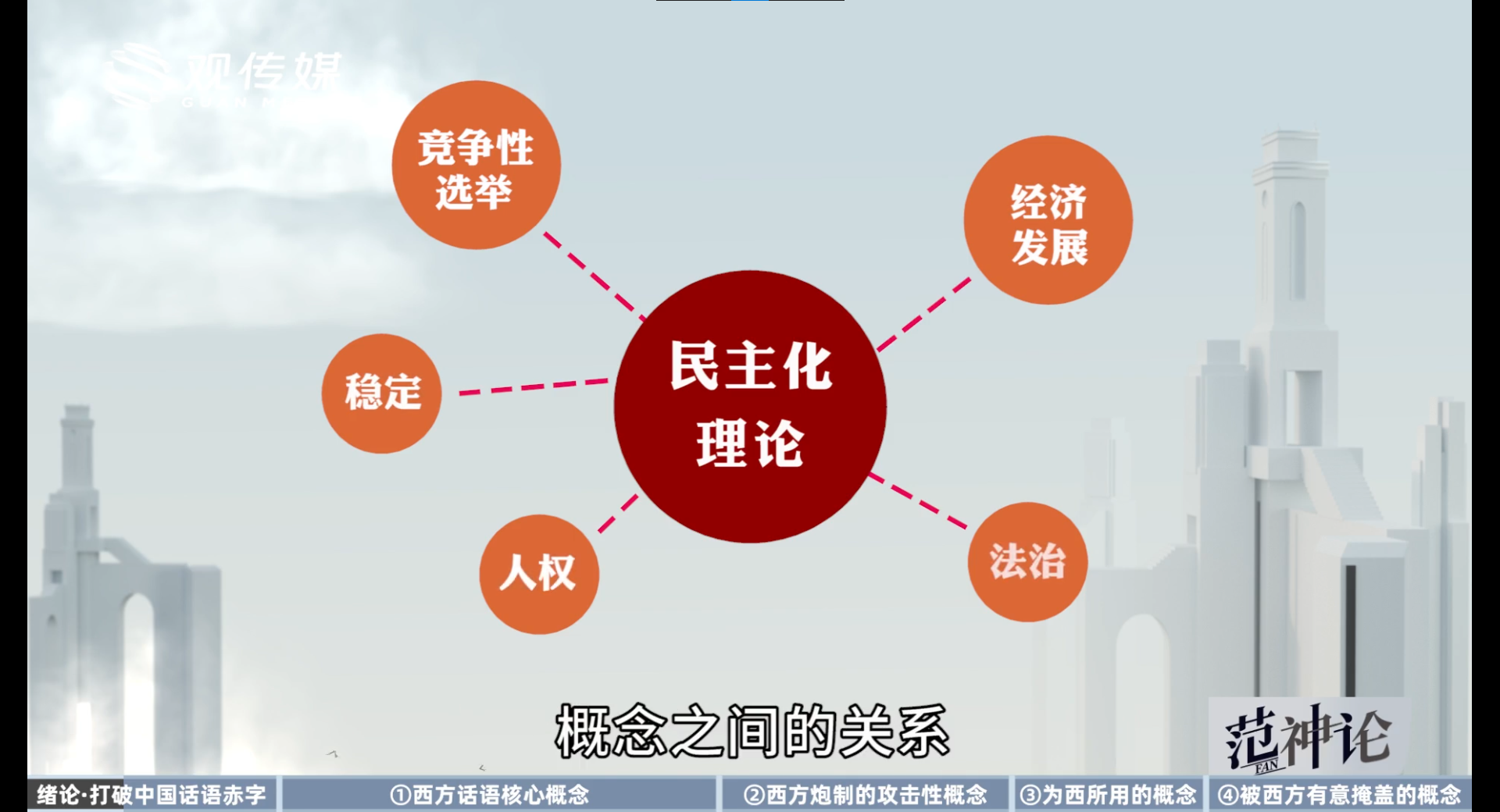 任何一个理论体系都是始于一些基本概念的,理论本质上是对这些现实的概念化解释。因此,在形式上理论必然表现为一系列相互关联的概念的联系。例如西方的民主化理论由如下相互关联的概念组成:
