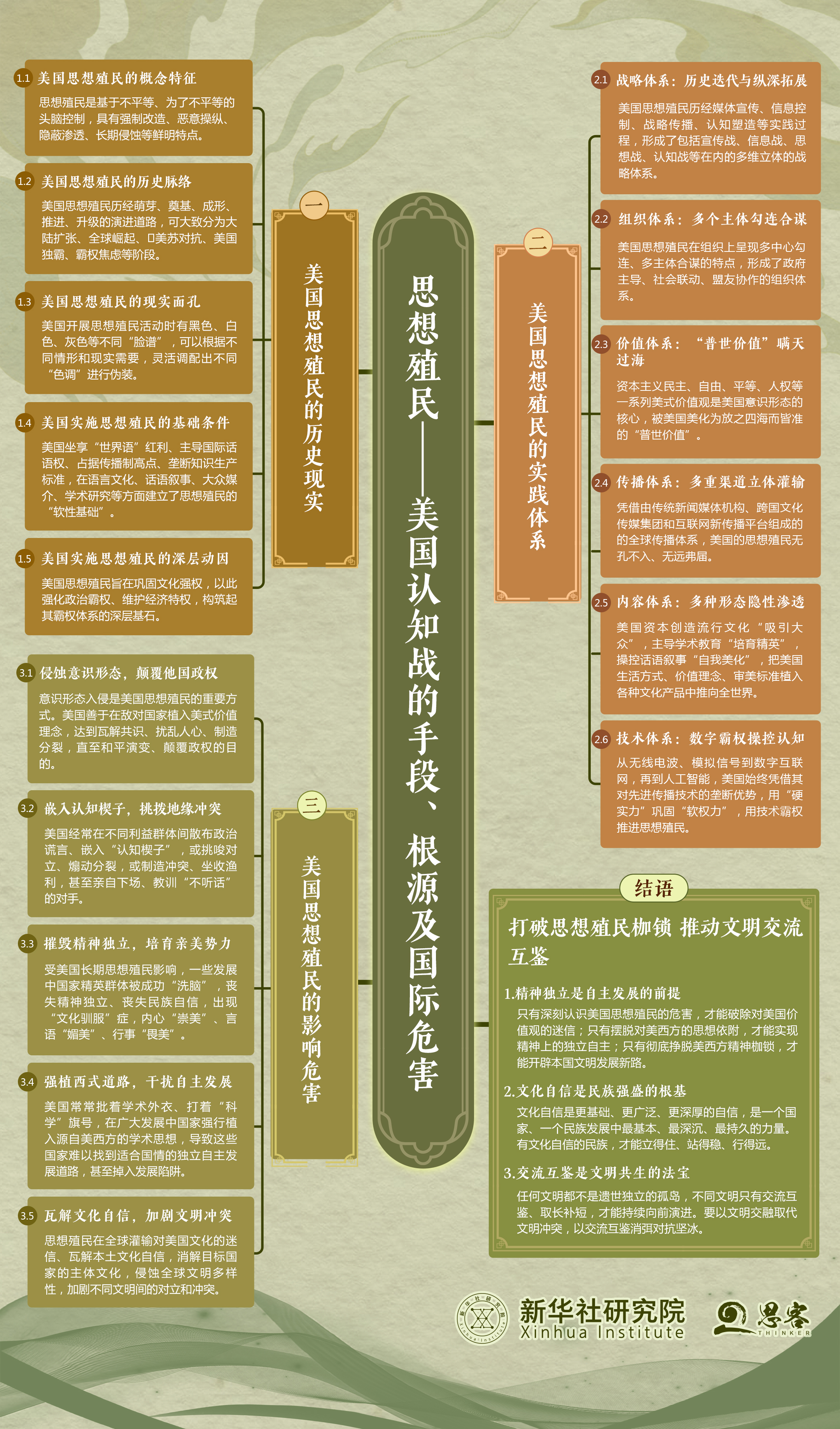 美国思想殖民对世界和平发展构成严重威胁。它侵蚀意识形态,颠覆他国政权;它嵌入认知楔子,挑拨地缘冲突;它摧毁精神独立,培育亲美势力;它强植西式道路,干扰自主发展。随着人工智能等新技术的发展升级,美国思想殖民操作手法更隐蔽,攻击范围更广泛,更需要一切热爱和平的人们正视和警惕。