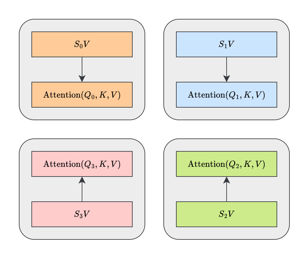 这个想法最初是以 Ring Self-Attention(RSA)9 的形式提出的。RSA 将序列切分成多个子序列,并在多个设备上并行计算自注意力。每个设备只计算自己子序列内的注意力,然后通过环形通信将中间结果传递给下一个设备,依此类推,直到所有设备都完成计算。